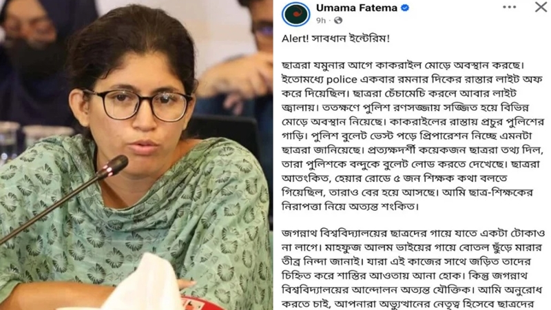 অন্তর্বর্তীকালীন সরকারের উদ্দেশে ‘Alert! সাবধান ইন্টেরিম!’ জগন্নাথ বিশ্ববিদ্যালয়ের শিক্ষার্থীদের আন্দোলন ইস্যুতে এভাবেই নিজের ফেসবুক ভেরিফাইড পেজে একটি বার্তা দিয়েছেন বৈষম্যবিরোধী ছাত্র আন্দোলনের মুখপাত্র উমামা ফাতিমা।