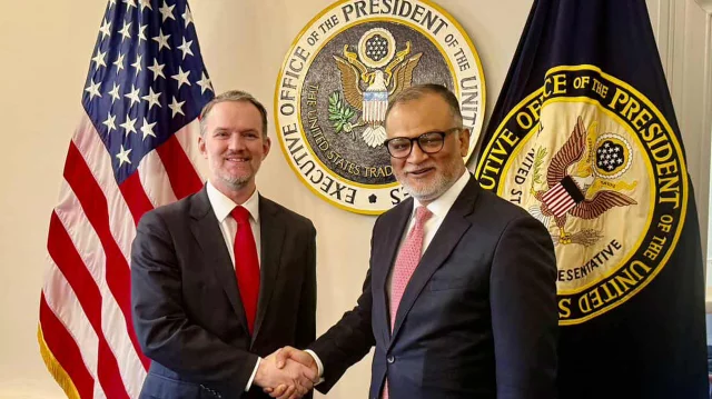 প্রেস উইংয়ের বার্তায় জানানো হয়, দ্বিতীয় দিনের আলোচনার একটি উল্লেখযোগ্য দিক হলো, বাণিজ্য উপদেষ্টা শেখ বশির উদ্দিন একান্তে বৈঠক করেছেন ইউএস ট্রেড রিপ্রেজেন্টেটিভ অ্যাম্বাসাডর জেমিসন গ্রিয়ারের সঙ্গে। গ্রিয়ার ট্রাম্প প্রশাসনে মন্ত্রী পদমর্যাদার অত্যন্ত গুরুত্বপূর্ণ ব্যক্তিত্ব। তার সঙ্গে শুল্ক বিষয়ক আলোচনার পাশাপাশি দুই দেশের বাণিজ্য ও স্বার্থ-সংশ্লিষ্ট বিষয় নিয়ে আন্তরিক পরিবেশে আলোচনা হয়েছে। আলোচনায় বাণিজ্য উপদেষ্টা বাংলাদেশের সার্বিক পরিস্থিতি তুলে ধরেছেন।