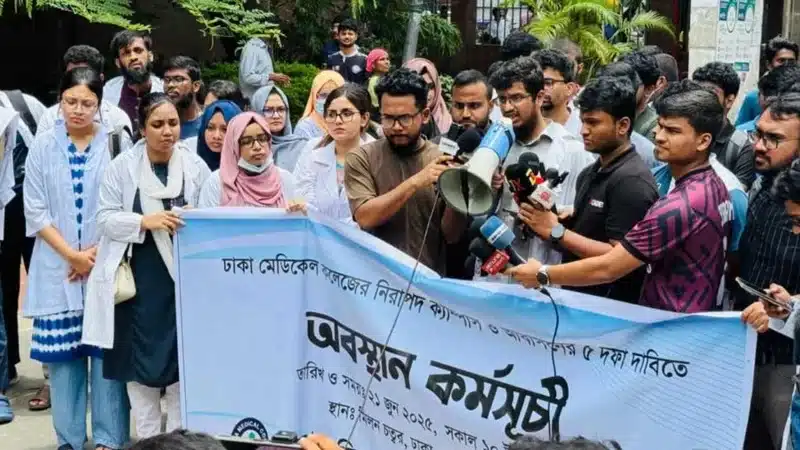 উল্লেখ্য, গত কয়েক সপ্তাহ ধরে ঢাকা মেডিকেল কলেজের আবাসিক ও একাডেমিক ভবনের ঝুঁকিপূর্ণ অবস্থার প্রতিবাদে আন্দোলন চালিয়ে আসছিলেন শিক্ষার্থীরা। শুক্রবার শিক্ষার্থীদের পক্ষ থেকে পাঁচ দফা দাবিতে স্মারকলিপি প্রদান ও মিলন চত্বরে অবস্থান কর্মসূচি পালন করা হয়।