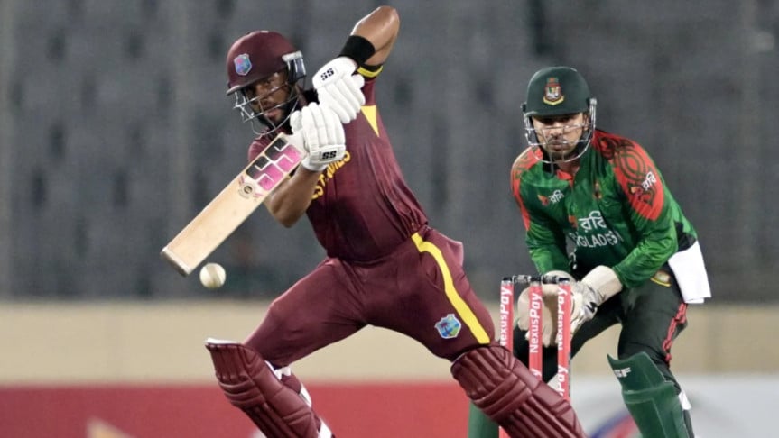 সুপার ওভারে ১০ রানের সংগ্রহ পায় ওয়েস্ট ইন্ডিজ। ওভারের শুরুটা ভালোই করেছিলেন মুস্তাফিজুর রহমান। প্রথম বলে এক রান দিলেও ফিরতি বলে শেরফান রাদারফোর্ডকে আউট করেছিলেন বাঁহাতি পেসার। চতুর্থ বলেও প্রায় ব্র্যান্ডন কিংকে আউটই করেছিলেন তিনি। যদি কাভারে ঠিকমতো ক্যাচটা নিতে পারতেন অধিনায়ক মেহেদী হাসান মিরাজ। কিন্তু সুযোগটা হাতছাড়া করেন। শেষ বলে ৪ মেরে ওয়েস্ট ইন্ডিজকে ১০ রানের সংগ্রহ এনে দেন শাই হোপ।