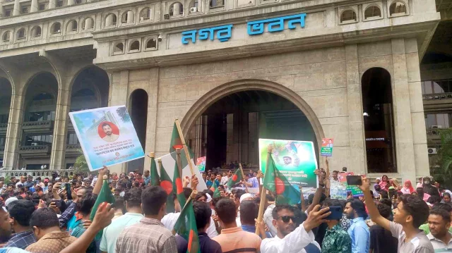 নির্বাচনী ট্রাইব্যুনালের কর্তৃক বিজয়ী ঘোষণা ও নির্বাচন কমিশন থেকে গেজেট প্রকাশের পরও ইঞ্জিনিয়ার ইশরাক হোসেনকে ঢাকা দক্ষিণ সিটি কর্পোরেশনের মেয়রের দায়িত্ব না বুঝিয়ে দেয়ায় মানববন্ধন করছে ঢাকা দক্ষিণ সিটি কর্পোরেশনের সাধারণ জনগণ।