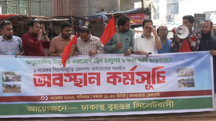 অনুমোদিত টাঙ্গুয়া এক্সপ্রেস ট্রেন চালুসহ আট দফা দাবিতে রাজধানীর মগবাজার রেলগেটে অবস্থান ও অবরোধ করেছে ঢাকাস্থ বৃহত্তর সিলেটবাসী।