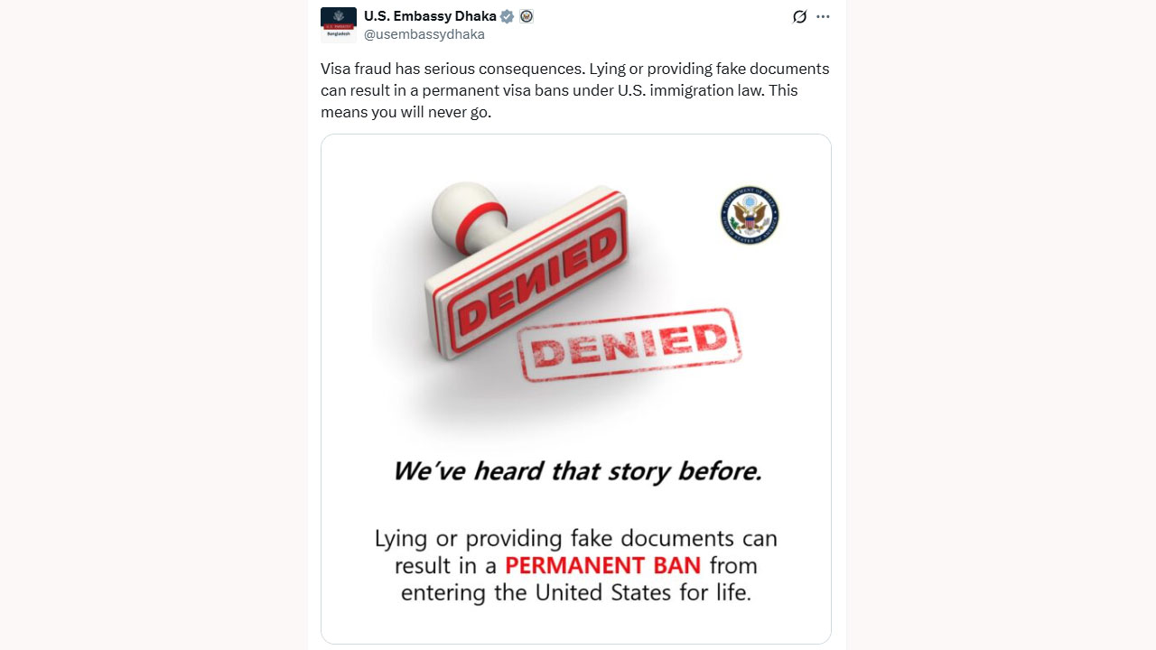 পো‌স্টে উল্লেখ করা হয়, ভিসা জালিয়াতির পরিণতি অত্যন্ত গুরুতর। মিথ্যা তথ্য বা ভুয়া নথিপত্র জমা দিলে যুক্তরাষ্ট্রের অভিবাসন আইনের আওতায় ভিসা স্থায়ীভাবে বাতিল হতে পারে। যার অর্থ দাঁড়ায় আপনি আর কখ‌নো যুক্তরা‌ষ্ট্রে যে‌তে প‌ার‌বেন না।