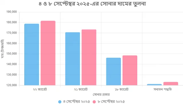 রোববার (৭ সেপ্টেম্বর) বাংলাদেশ জুয়েলার্স সমিতি (বাজুস) এক বিজ্ঞপ্তিতে এই তথ্য জানায়। নতুন দাম কার্যকর হবে সোমবার (৮ সেপ্টেম্বর) থেকে।