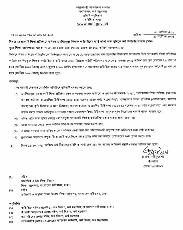 মঙ্গলবার (২১ অক্টোবর) অর্থ মন্ত্রণালয়ের প্রবিধি-৩ শাখা থেকে উপসচিব মোসা. শরীফুন্নেসার সই করা এক বিজ্ঞপ্তিতে এই তথ্য জানানো হয়েছে।