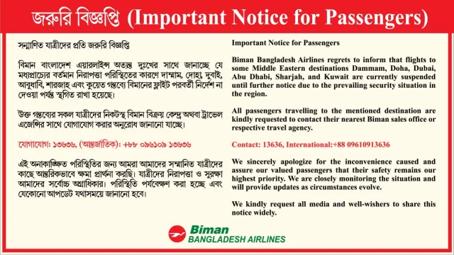বিজ্ঞপ্তিতে ওই গন্তব্যগুলোর যাত্রীদের নিকটস্থ বিমান বিক্রয় কেন্দ্র অথবা ট্রাভেল এজেন্সির সঙ্গে যোগাযোগ করতে বলা হয়েছে। প্রয়োজনে ১৩৬৩৬ অথবা +৮৮ ০৯৬১০৯ ১৩৬৩৬ নম্বরে যোগাযোগ করার অনুরোধ করা হয়েছে। পাশাপাশি যে কোনো আপডেট সময়মতো জানানোর কথাও জানিয়েছে বিমান।